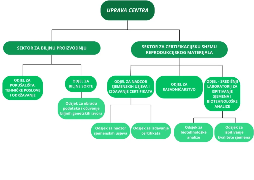 Centar za sjemenarstvo i rasadničarstvo svoje djelatnosti provodi kroz sljedeće sektore s odjelima: