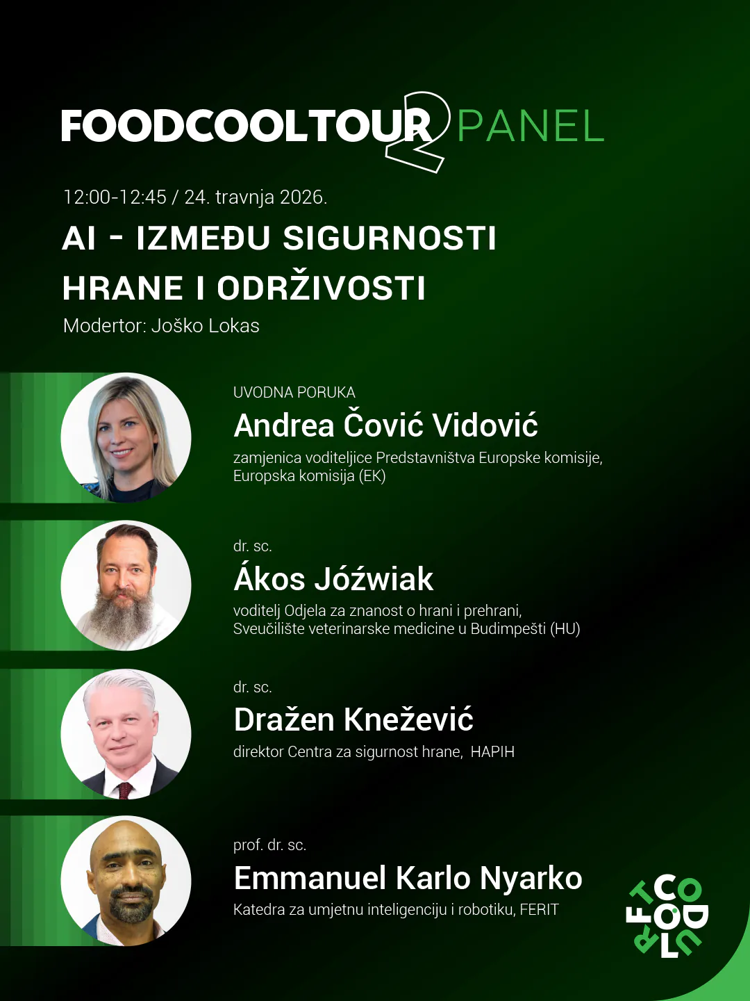 Brzorastuća upotreba umjetne inteligencije rapidno mijenja globalne prehrambene sustave, nudeći moćne alate za optimizaciju korištenja raspoloživih resursa, poboljšanje produktivnost, otpornosti i sigurnosti hrane u eri klimatskih neizvjesnosti. Takve inovacije moraju biti uravnotežene s etičkim, ekološkim i socioekonomskim razmatranjima, kako bi se osiguralo da napredak potaknut umjetnom inteligencijom doprinosi dugoročnoj održivosti, a ne produbljuje postojeće nejednakosti. Ovaj panel dat će uvid u aktualnosti u području umjetne inteligencije, sigurnosti hrane i održivog razvoja, okupljajući istraživače, kreatore politika i predstavnike poljoprivredno prehrambenog lanca, koji će pokušati dati odgovore na to kako inteligentne tehnologije mogu podržati otpornije, učinkovitije, pravednije i ekološki osviještenije prehrambene sustave za budućnost.