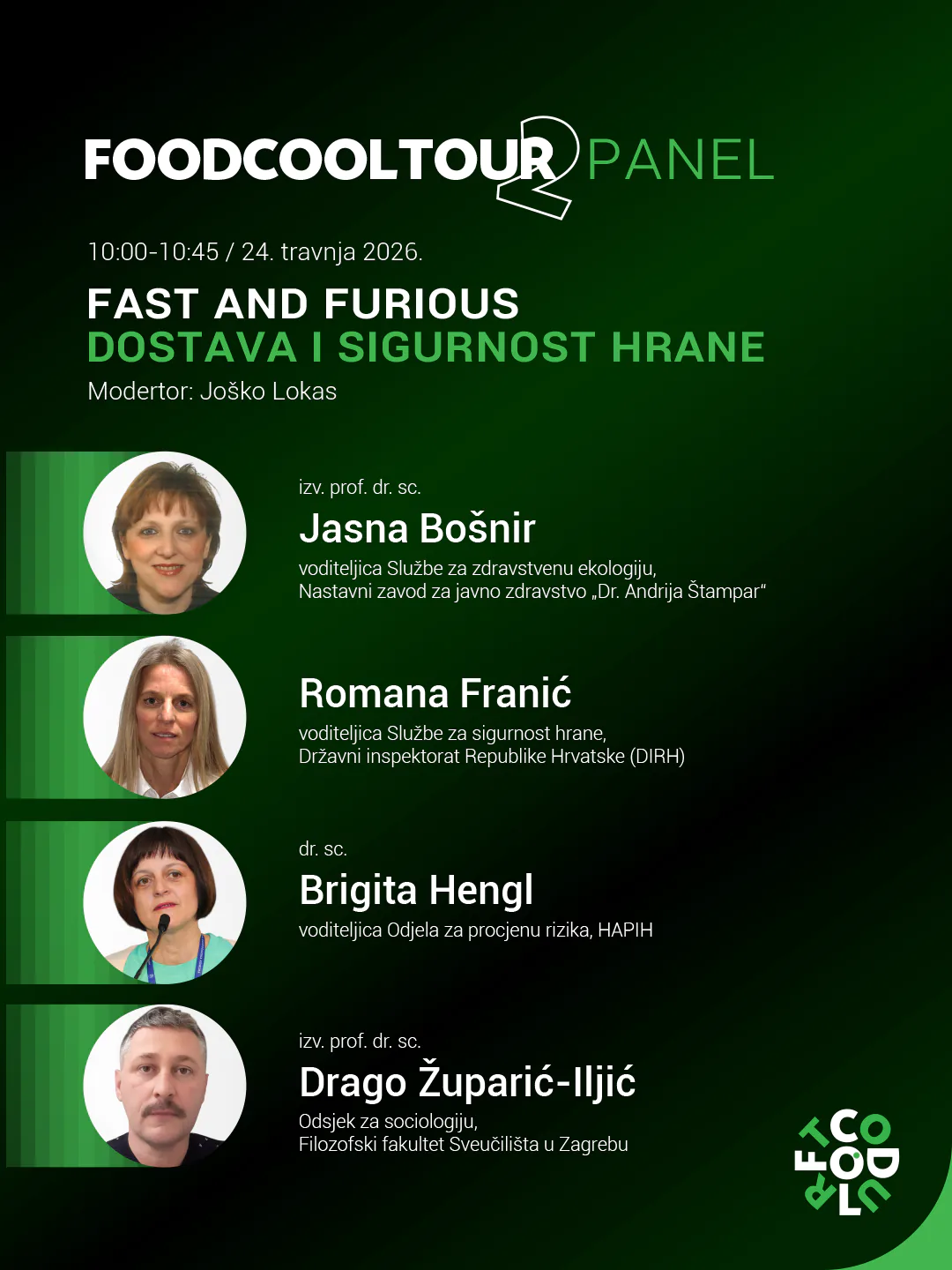 Glavni izazovi u dostavi hrane uključuju kašnjenja u isporuci, pogrešne ili nepotpune narudžbe, ohlađenu hranu ili oštećenu ambalažu, kao i neadekvatne uvjete čuvanja i transporta hrane, koji mogu negativno utjecati na sigurnost hrane. Na panelu će se raspravljati o dostavi hrane u kontekstu sigurnosti hrane, s naglaskom na potencijalne rizike, odgovornosti dionika i mjere za zaštitu zdravlja potrošača.