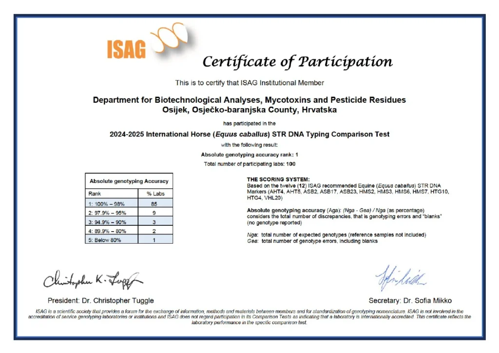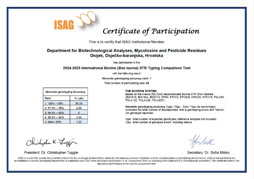 Odjel za genetske analize, koji djeluje u okviru Centra za stočarstvo HAPIH-a, prošle je godine po drugi put sudjelovao u međulaboratorijskom testiranju koje provodi ISAG (International Society for Animal Genetics). Rezultate usporednih testova tipiziranja mikrosatelitskim markerima (STR typing) za goveda i konje zaprimili smo krajem 2025. godine. U oba testa laboratorij HAPIH-a svrstan je u 1. rang s pogreškom tipiziranja manjom od 2 %, što potvrđuje visoku kvalitetu naših usluga genotipizacije i potvrđivanja roditeljstva na međunarodnoj razini te nas svrstava među najbolje svjetske laboratorije.